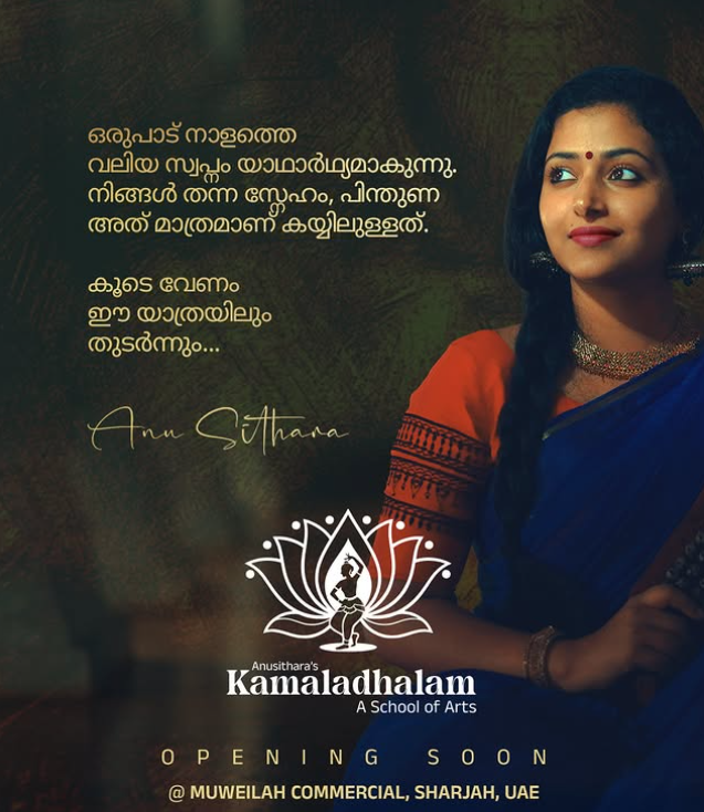 মালায়লাম অভিনেত্রী এবং প্রশিক্ষিত ধ্রুপদী নৃত্যশিল্পী অনু সিতারা বহু বছরের স্বপ্ন পূরণ করেছেন। তিনি শারজাহের মুওয়েলাহ কমার্শিয়ালে তার নিজস্ব নৃত্য বিদ্যালয় ‘কমলাধালাম’ খুলেছেন।