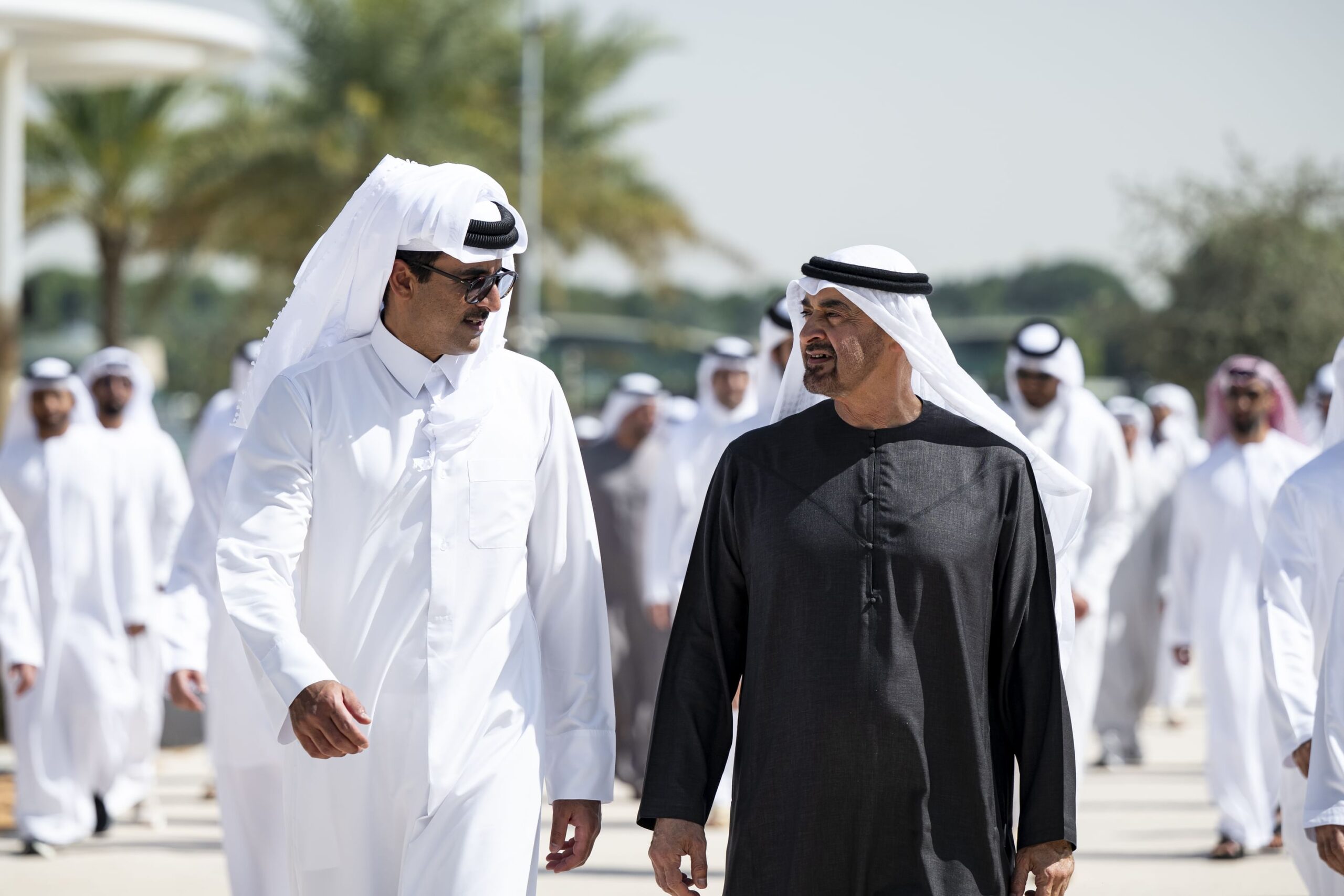 কাতারের শাসক এবং তার সফরসঙ্গী প্রতিনিধিদলকে আল-বাতিন বিমানবন্দরে পৌঁছানোর পর সংযুক্ত আরব আমিরাতের প্রেসিডেন্ট শেখ মোহাম্মদ বিন জায়েদ আল-নাহিয়ান স্বাগত জানান।