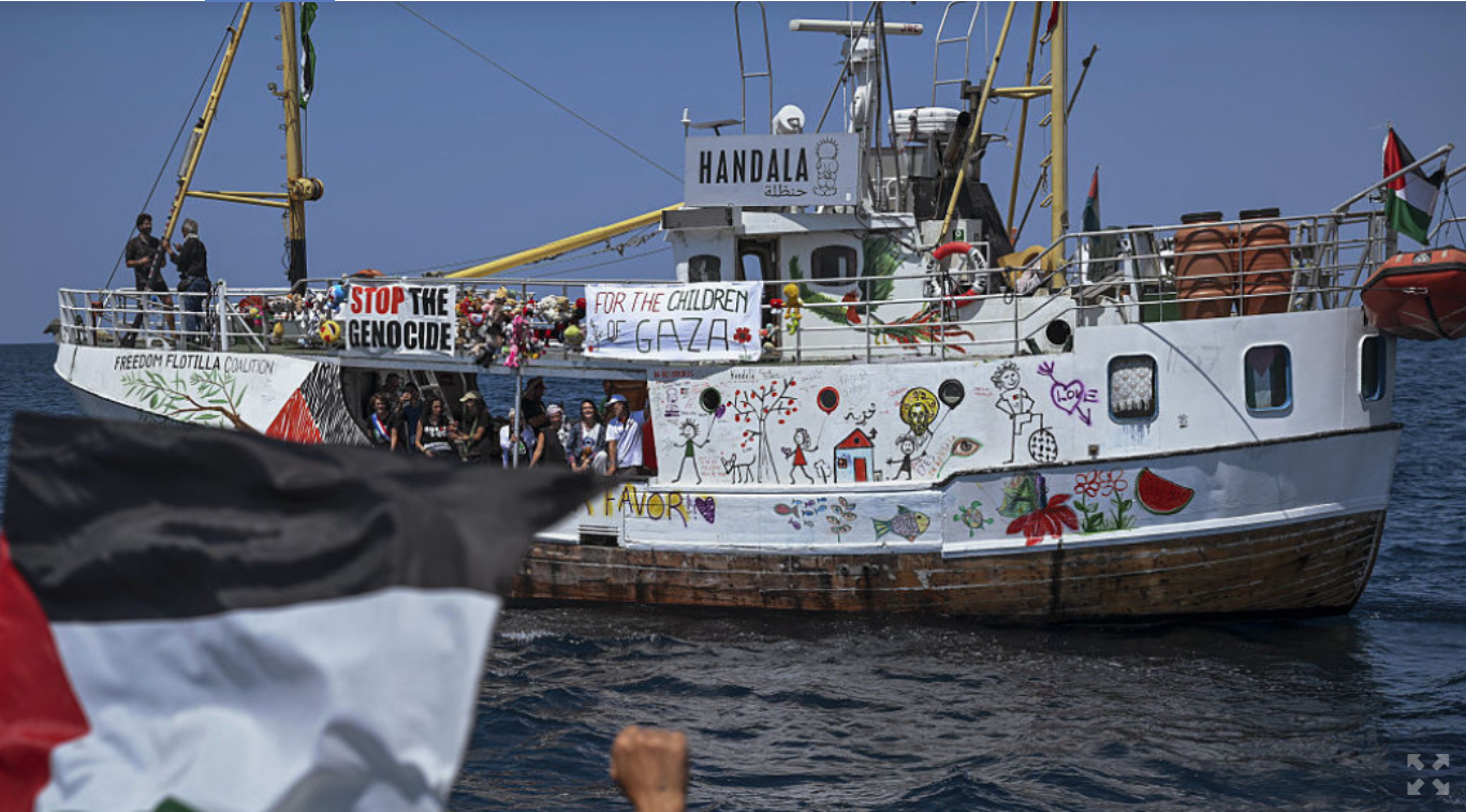 রবিবার ইসরায়েলি বাহিনী ফিলিস্তিনিপন্থী কর্মী নৌকা হান্দালাকে আন্তর্জাতিক জলসীমায় আটক করে জাহাজের ক্রুদের আটক করার পর আশদোদ বন্দরে নিয়ে আসে, একজন এএফপি সাংবাদিক দেখেছেন।