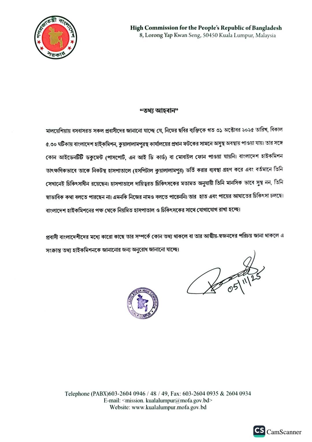 বাংলাদেশ হাইকমিশনের পক্ষ থেকে জানানো হয়েছে, রোগীর চিকিৎসা বিষয়ে নিয়মিতভাবে হাসপাতাল কর্তৃপক্ষের সঙ্গে যোগাযোগ রাখা হচ্ছে। একই সঙ্গে প্রবাসী বাংলাদেশিদের প্রতি অনুরোধ জানানো হয়েছে, যদি কারও কাছে ওই ব্যক্তির বিষয়ে কোনও তথ্য থাকে বা তার পরিবারের সঙ্গে যোগাযোগের উপায় জানা থাকে, তবে তা যেন দ্রুত হাইকমিশনকে জানানো হয়।