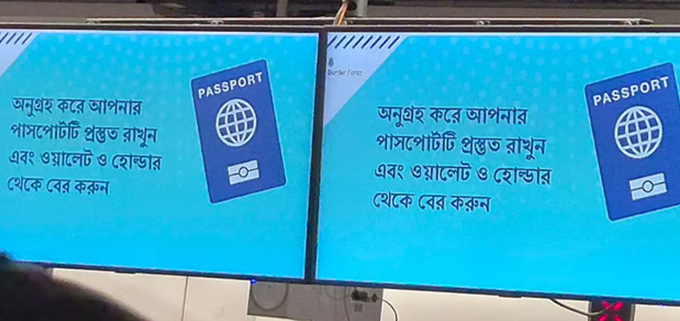বুধবার হিথরো বিমানবন্দরের টার্মিনাল ৪–এর ইমিগ্রেশন কাউন্টারে প্রদর্শিত নির্দেশনায় লেখা ছিল, “অনুগ্রহ করে আপনার পাসপোর্টটি প্রস্তুত রাখুন এবং ওয়ালেট ও হোল্ডার থেকে বের করুন।” ইংরেজি, আরবি ও হিন্দিসহ আরও কয়েকটি আন্তর্জাতিক ভাষার সঙ্গে এবার বাংলা ভাষাও যুক্ত হয়েছে।